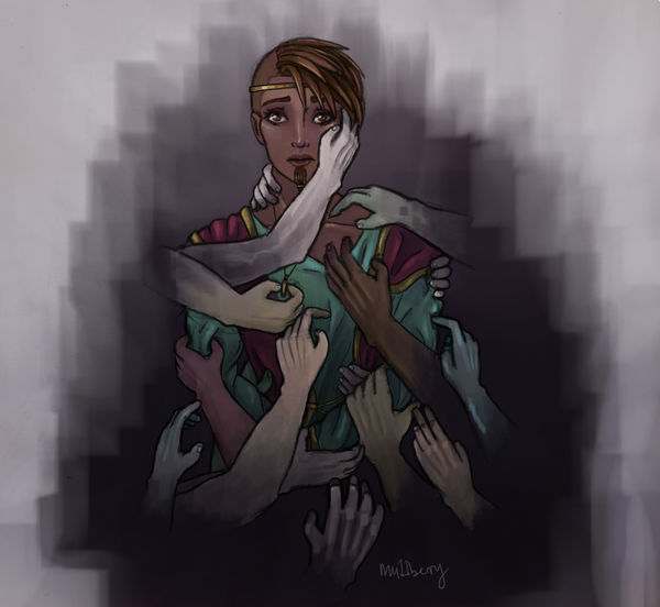 Some of the hands are based on one of the above ideas and some are just there because I like to make myself heartbroken. The most important conceptually are his father’s hand clenched over his heart, Talia’s hand not quite reaching him, and Ahriman’s hand on its way to cover his eyes.